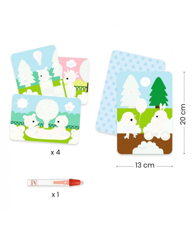 Inhoud: 4 geïllustreerde platen (13 x 20 cm) van zacht plastic met een wit vlak dat verdwijnt, een pen met waterreservoir en 1 dikke kartonnen houder.