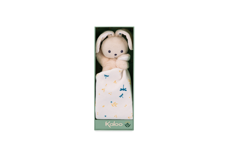 Het konijn met haar kleine zachte lichaam van micro-velours is eenvoudig vast te pakken bij het lichaam of de lange oren. De vierkante deken in haar handen is voorzien van kleine libellen die tussen de gouden twijgen dwarrelen. Deze fijne en poëtische opdruk bevindt zich tevens in de oren van het konijn en versterkt het geheel.