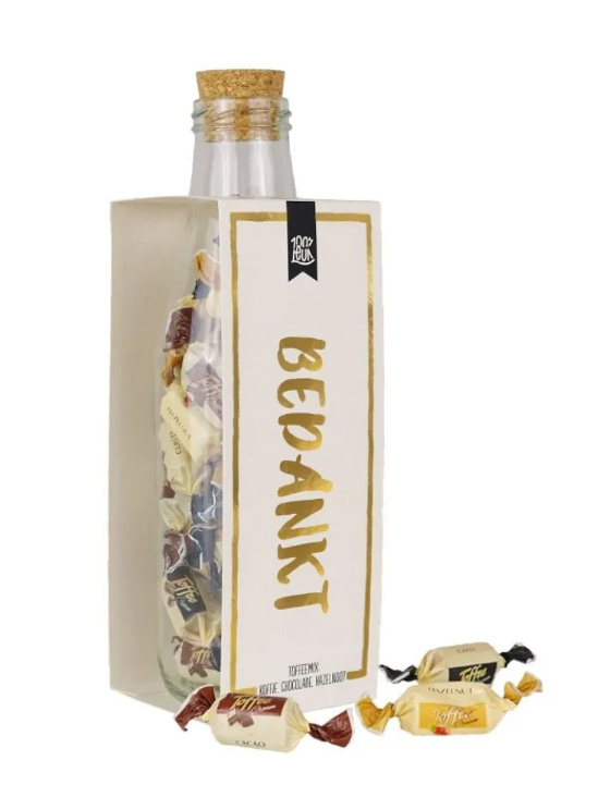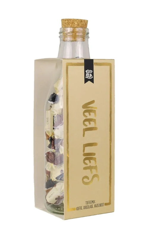 Artikelnummer: GR0272Een fles gemaakt van gerecycled glas gevuld met drie lekkere smaken toffees namelijk chocolade, hazelnoot en koffie. Heb je onverwachts je zoon of dochter kunnen onderbrengen bij je zwager, omdat jij onverwachts de deur uit moest? Een aardigheidje als bedankje, fijn dat je op elkaar kan rekenen! Ook is dit een leuk zakelijk cadeau, bedank je team voor het harde werken. Leuk om te weten is dat deze flessen verwerkt worden door de LEUKerds!