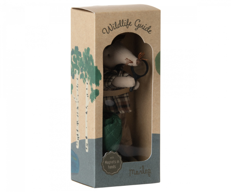 Artikelnummer: 17-3301-00Deze natuurgidsmuis is klaar voor een wandeltocht. De gids is gekleed om te wandelen en neemt een slaapzak en een vergrootglas mee om de natuur te verkennen. Deze stijl is papa/mama-formaat en heeft magneten in de handen.