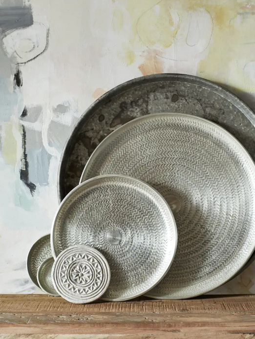 Gerecycled aluminium materiaal gevormd tot nieuwe vormen en met de hand gedecoreerd door Indiase ambachtslieden.