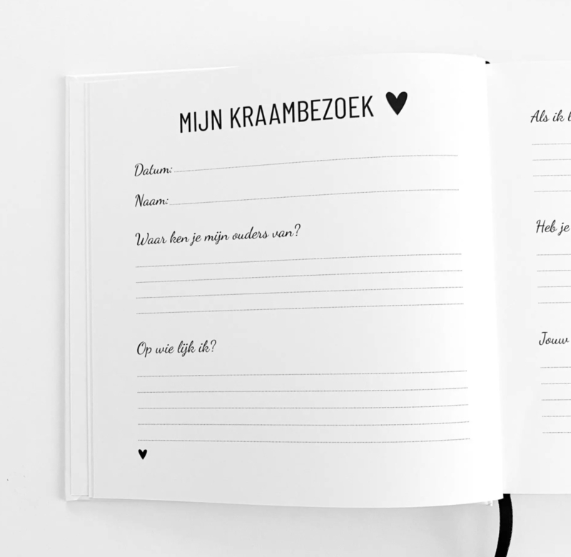 In dit kraambezoek invulboek is alle ruimte om mooie wensen voor de baby op te laten schrijven door de kraamvisite. Op wie lijkt de baby? Wat wensen zij voor de toekomst? Er is plek voor 2 ouders om wat over zichzelf in te vullen. Verder is  er ruimte voor 30 personen om een aantal vragen te beantwoorden en er is voldoende ruimte voor foto’s en tekeningen.