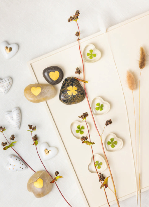 Artikelnummer: 17317Deze gepolijste stenen zijn voorzien van een hart, een klaver of een engel.
