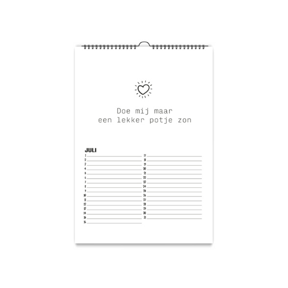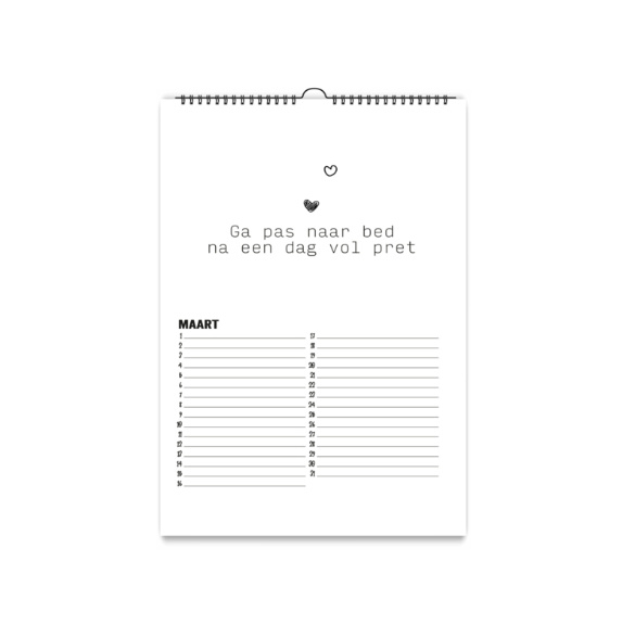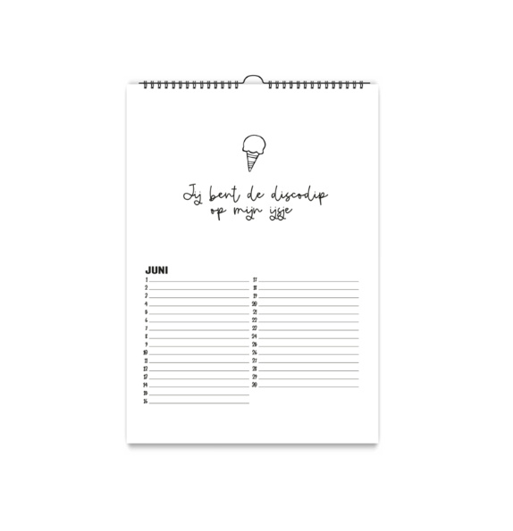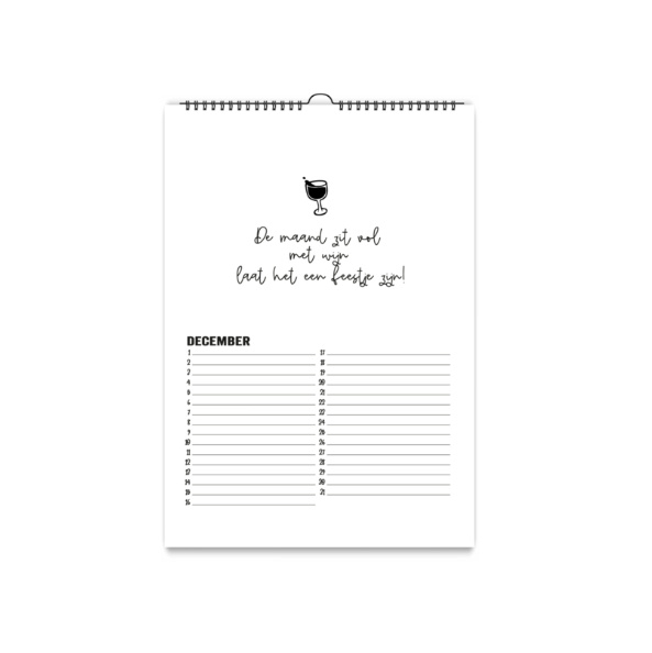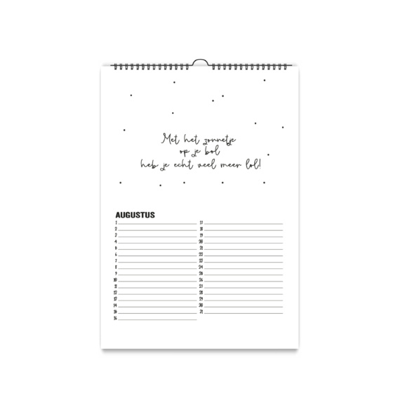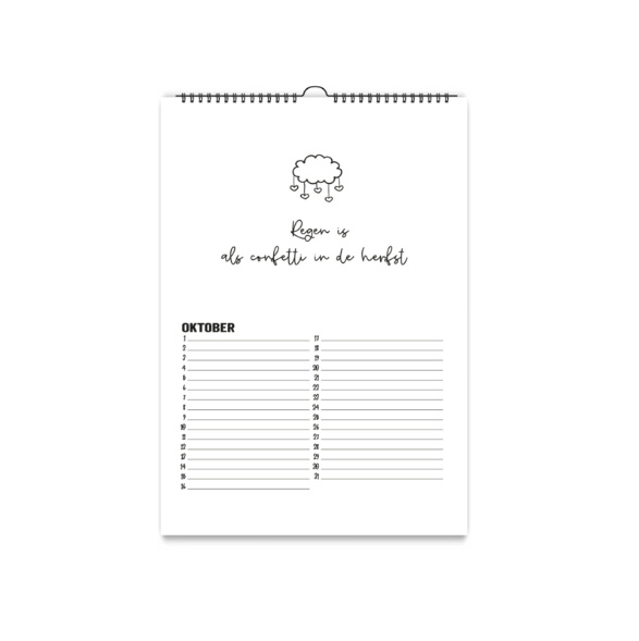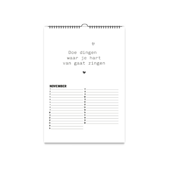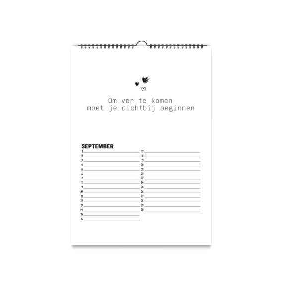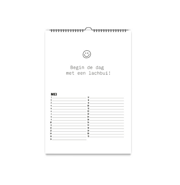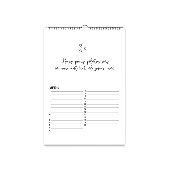 De kalender is wit met een zwarte wire-o binding met ophanghaakje.