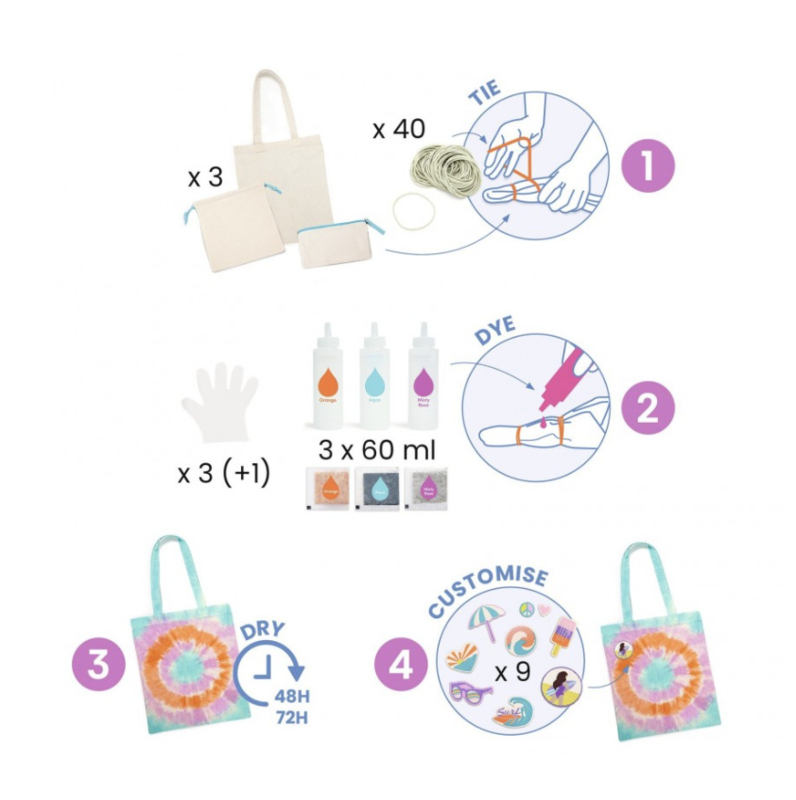 Artikelnummer: DJ07942Een creatieve set om de tie-dye-verftechniek, met zijn unieke kleurverloop, te ontdekken en verschillende motieven te creëren zoals een echte textielontwerper. Hiervoor laat het kind zich leiden en leert het de stof van de accessoires te knopen (tie) en om ze te verven (dye) met behulp van de meegeleverde kleurstoffen, op basis van 3 verschillende technieken om motieven te creëren: cirkelvormige motieven (roos), geometrische vormen en lijnen. Zodra de accessoires drogen, kunnen ze naar wens worden gepersonaliseerd dankzij de meegeleverde insignes die voorzien zijn van door warmte geactiveerd kleefmiddel. Elke creatie is uniek!