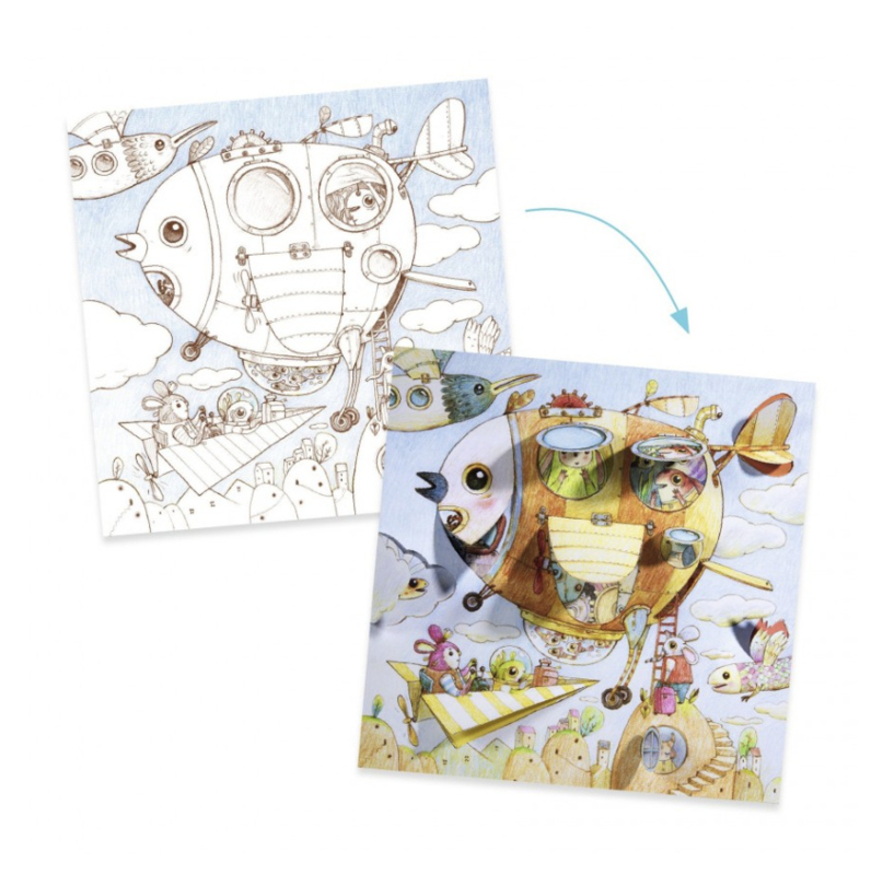 Tijdens het kleuren, tilt het kind de vensters op en ontdekt het kleine details om in te kleuren! Een reis vol verrassingen!