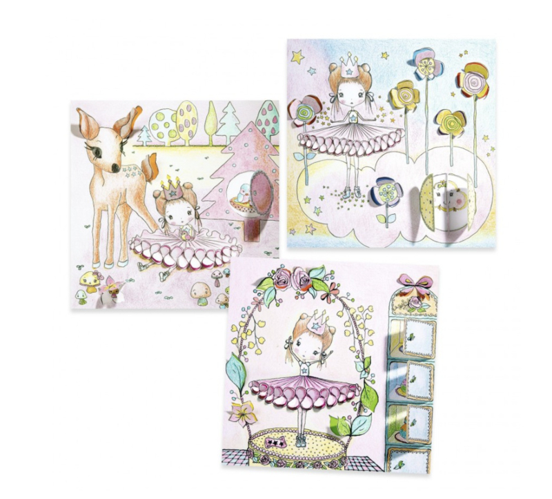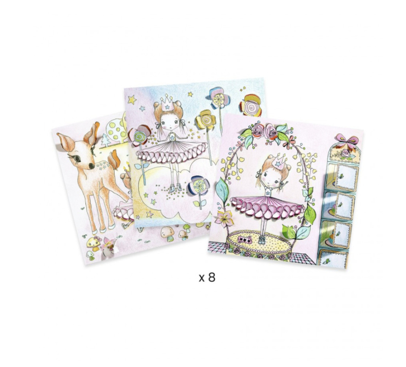 - 8 dubbele kaarten om in te kleuren (4 kaarten X2). Met flapjes en uitsparingen in 3D.