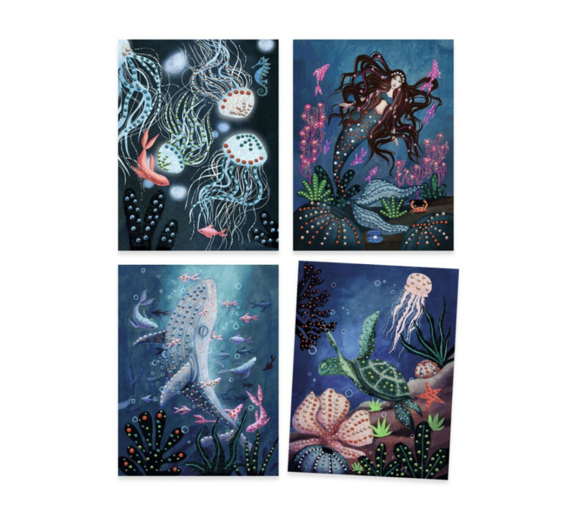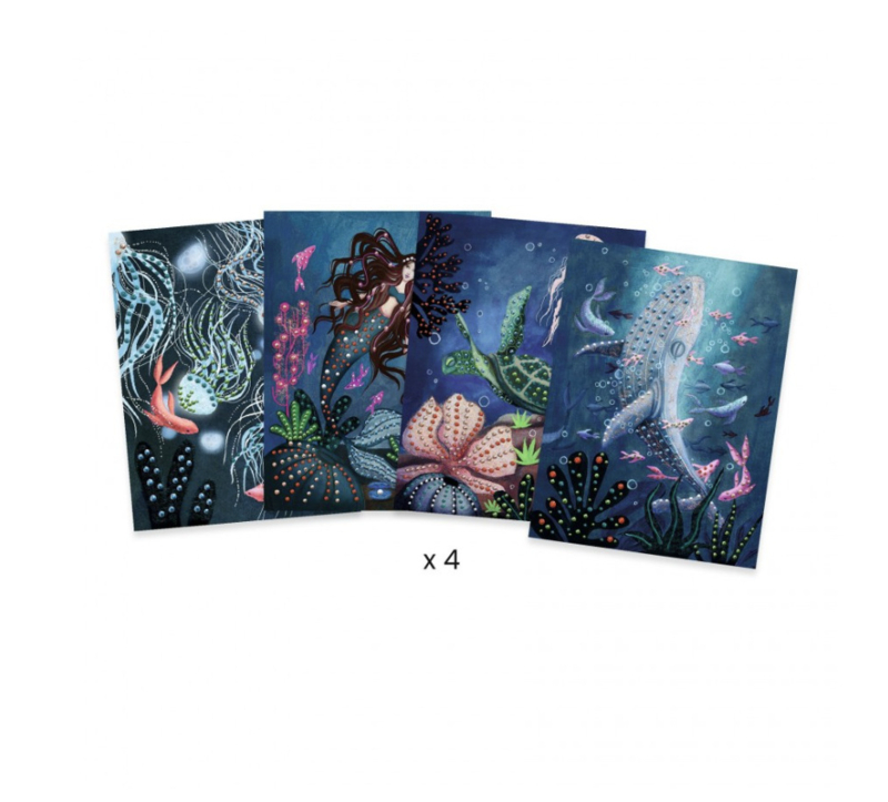 -4 geillustreerde schilderijtjes (21 x 28 cm) om af te werken, 8 kleuren parelmoerverf, 1 penseel,