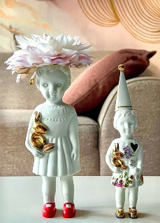 Deze porseleinen popjes, met hun glinsterende gouden details en rode schoentjes, dragen de onmiskenbare signatuur van Lammers&Lammers. Lieflijk, grappig en altijd met een knipoog, stralen ze pure persoonlijkheid uit.