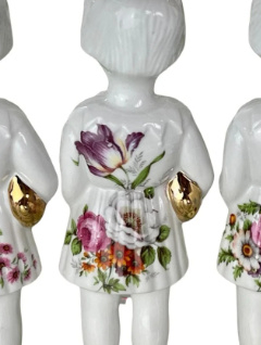 Kleine jongens en meisjes met puntmutsjes. Kleine jongens zijn mat en hebben een geglazuurde broek en muts. De kleine meisjes zijn All-over geglazuurd. Ze zijn geschikt als vaasje voor één bloem.
