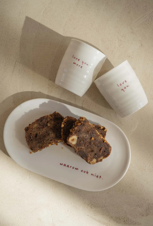 Deze aardewerken serveerschaal is wit met daarop in rode letters 'waarom ook niet'.