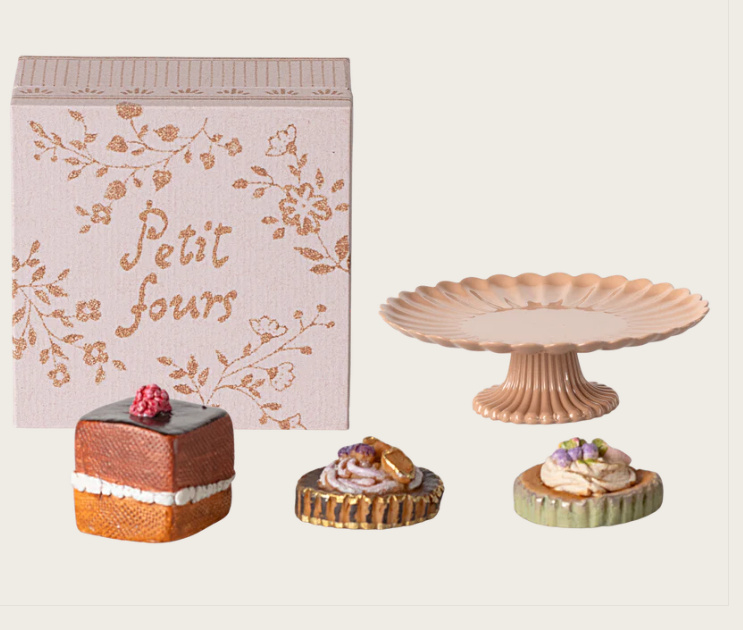 Deze kleine set van 3 heerlijke taarten op een prachtig versierde taartstandaard in de kleur roze is een must have.