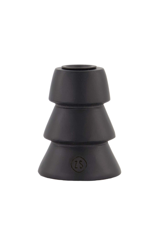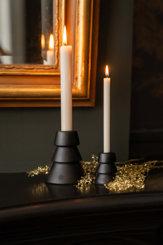 Houten kandelaar in het zwart in de vorm van een kerstboom. Afmeting: 5 x 6 cm