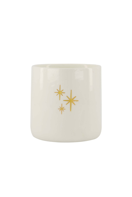 Deze heerlijke geurkaars zit in wit keramiek. Daarop staan gouden sterren.