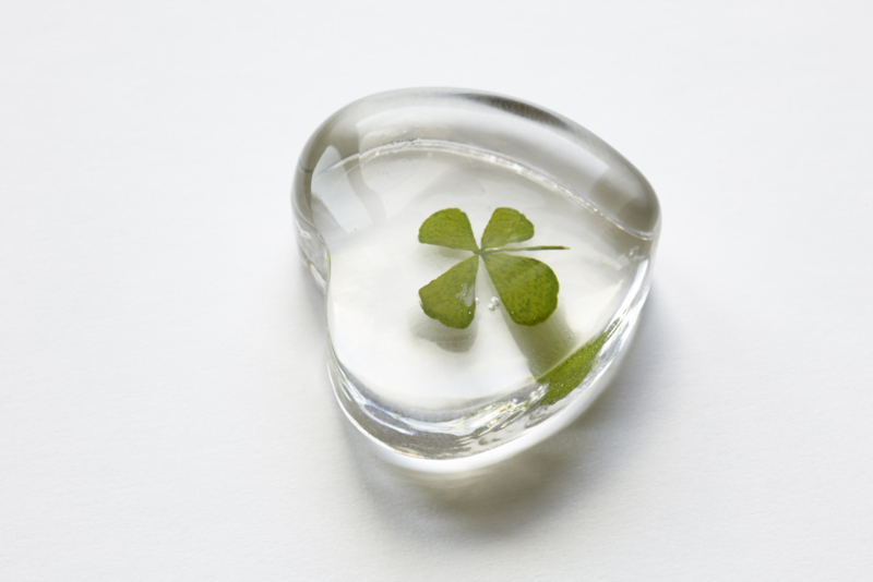 Hartje gemaakt van Epoxy met erin een klavertje vier.