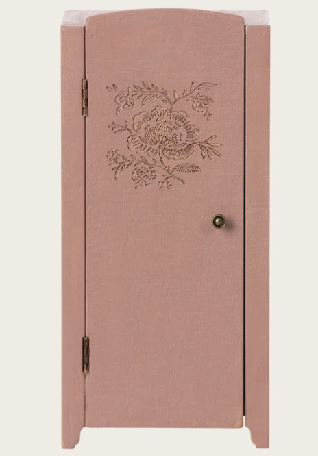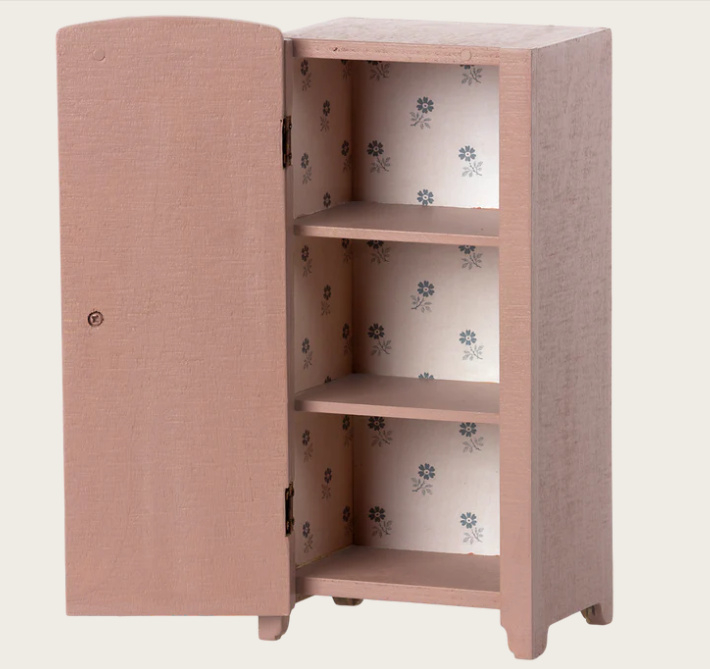 Deze vintage-look kast heeft een prachtige reliëf bloemenprint op de voorkant en prachtig bedrukt behang aan de binnenkant. De planken aan de binnenkant zorgen ervoor dat het organiseren kan beginnen. Deze kast past in het Maileg muzienhuis en poppenhuis.