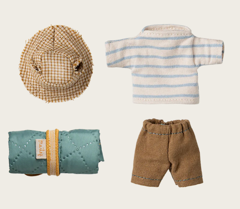 Deze wandelmuis, grote broer, is goed voorbereid op een wandeltocht in de wilde natuur. Hij is gekleed voor dagenlange wandelingen en neemt zijn slaapzak mee voor nachten onder de sterren. Hij heeft magneten in haar handen., dus hij kan ook erg goed op de fiets of step.