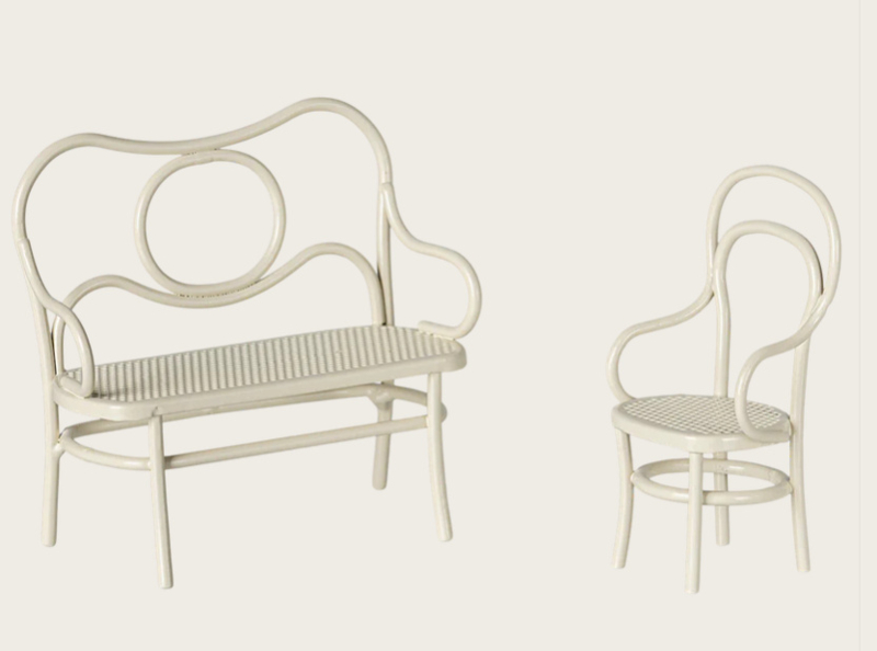 Caféset meubilair dat past bij de Kleine zus/broer en Grote zus/broer muizen. De set bestaat uit een bank, een stoel en een tafel, en is een perfecte plek om te genieten van de middag thee.