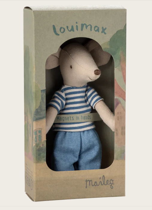 Deze muis heet LouiMax en hij is een echte avonturier. Hij draagt een blauw gestreept shirt en een spijkerbroek. De muis heeft magneten in zijn handen en wordt verkocht in een decoratiedoos. De muis is van het formaat grote broer.