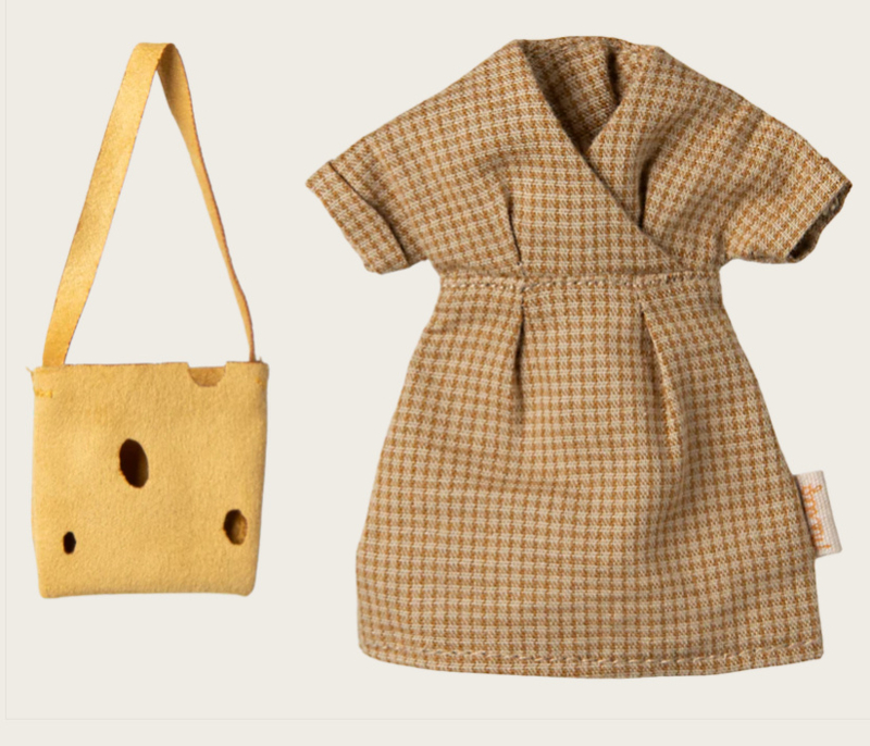 Artikelnummer: 17-5302-00Moeder muis in lichtbruine bodystof. Ze draagt een jurk en een tas met kaasgaten. Deze mamamuis past bij meubels en accessoires in maat muis.