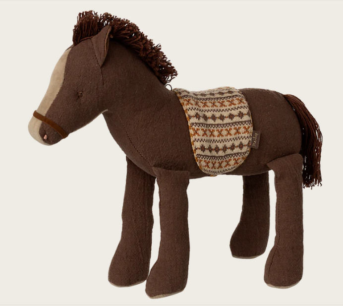 Artikelnummer: 16-5938-00De bruine pony is gemaakt van een zachte katoen/linnen stof. De manen en staart zijn van katoenen koorden en het zadel is gemaakt van zachte gebreide stof die garandeert dat de rit comfortabel is.