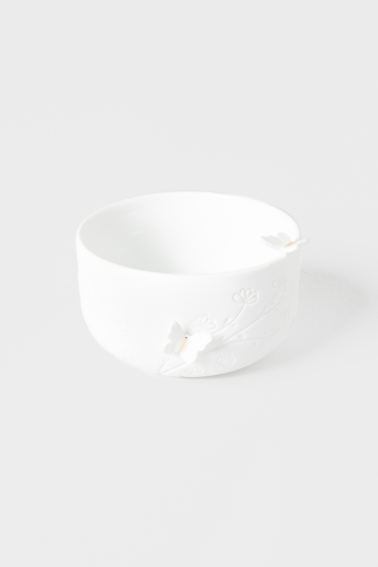 Design: Özkaya. Material: porcelain. Glazed on the inside, unglazed on the outside. With 3D elements, unglazed, partially with gold decal