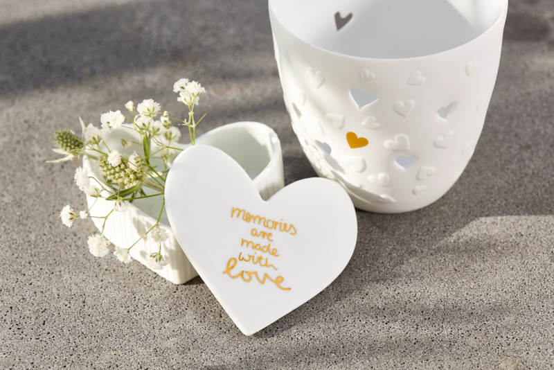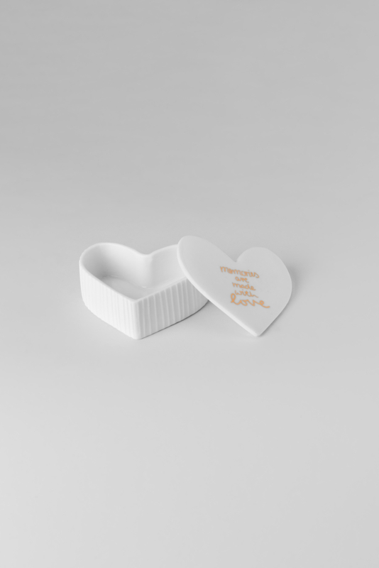 Artikelnummer: 17748Porseleinen doosje in de vorm van een hart. Op het hartje staat de tekst: Memories are made with love.