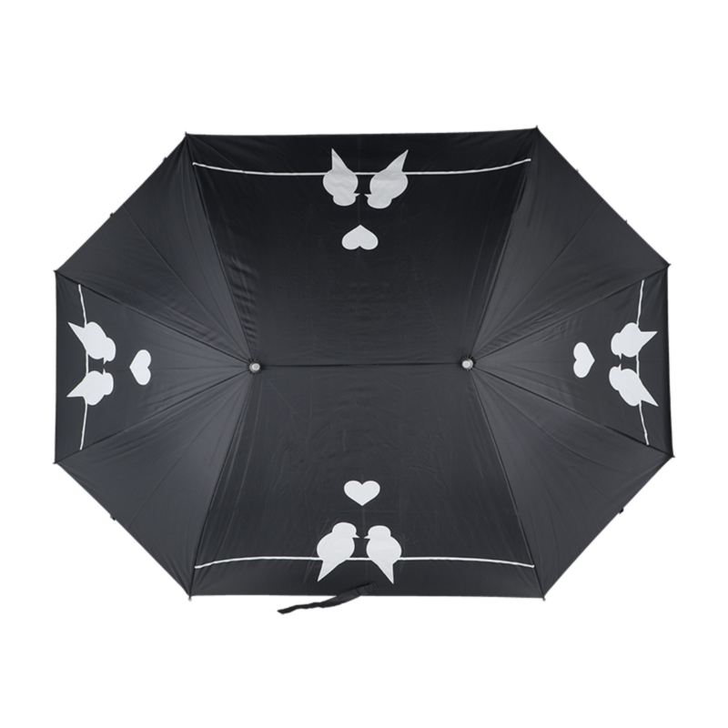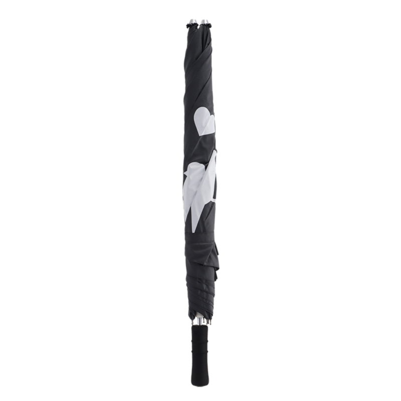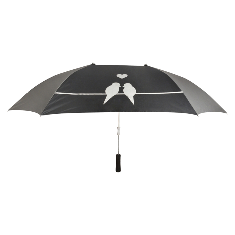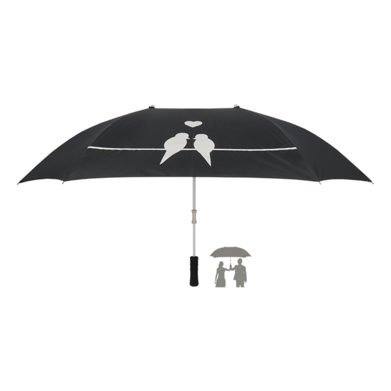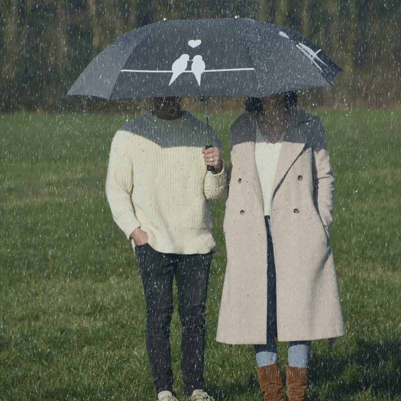 Romantisch genieten in de regen. Dankzij de extra brede spanwijdte van deze paraplu kunnen twee personen naast elkaar in de regen lopen zonder nat te worden. De compacte ronde handgreep in het midden is daarbij niet storend, en kan door beide personen vast gepakt worden.