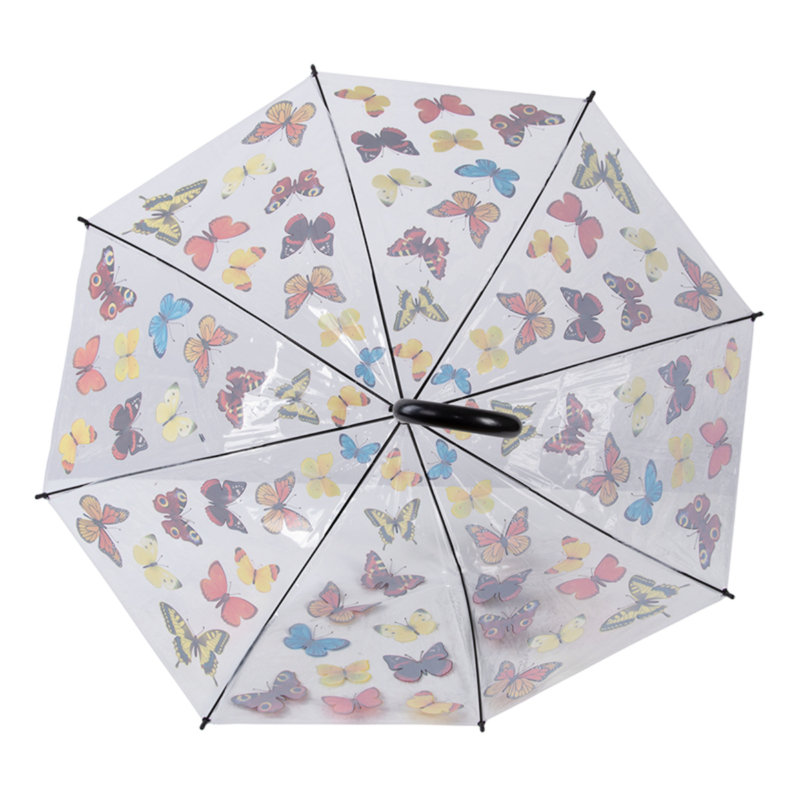 Artikelnummer: TP381Deze transparante paraplu met vlinderprint maakt wandelen in de regen leuk. Omdat het materiaal transparant is, is de omgeving goed te zien tijdens het wandelen.