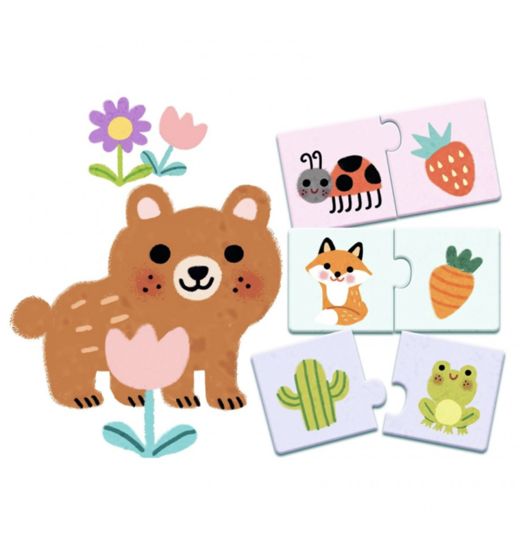 De duo-puzzel Kleuren is een educatieve puzzel om te beginnen met het leren van kleuren. Het kind zoekt het voorwerp en het dier in dezelfde kleur bij elkaar. Vanaf 2 jaar.