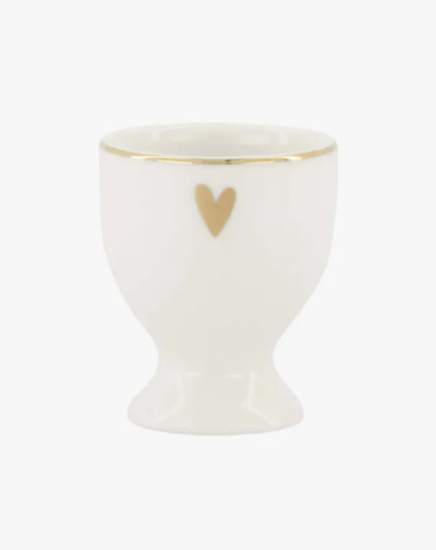 Deze set van 2 Zusss eierdopjes maken je ontbijttafel helemaal af! Deze sjieke eierdopjes zijn wit van kleur met daarop een gouden hartje en randje aan de bovenkant. Deze aardewerken eierdopjes hebben een diameter van 5cm en zijn 6,5cm hoog.