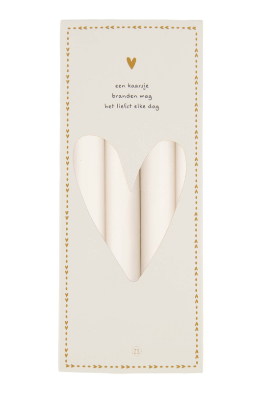 Een kaarsje branden mag het liefst elke dag! In deze verpakking zitten 4 rustieke Zusss kaarsen. Deze hebben een gebroken witte kleur en zijn en zijn 20x2,2 centimeter groot. Elke kaars heeft ongeveer 11 branduren. Let op: in de kleine kandelaartjes van Zusss passen deze kaarsen niet. Bestel hiervoor een doosje met 10 smalle kaarsjes.