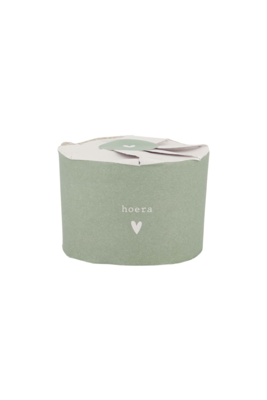 Deze geurkaars van Zusss ziet er o zo leuk uit! Het liefst laat je de wikkel er omheen zitten. Om deze geurkaars zit een groene wikkel met een hartje en de tekst: hoera. Het glaasje heeft een diameter van 7,5cm en is 7,5cm hoog. Wie verras jij met deze geurkaars?