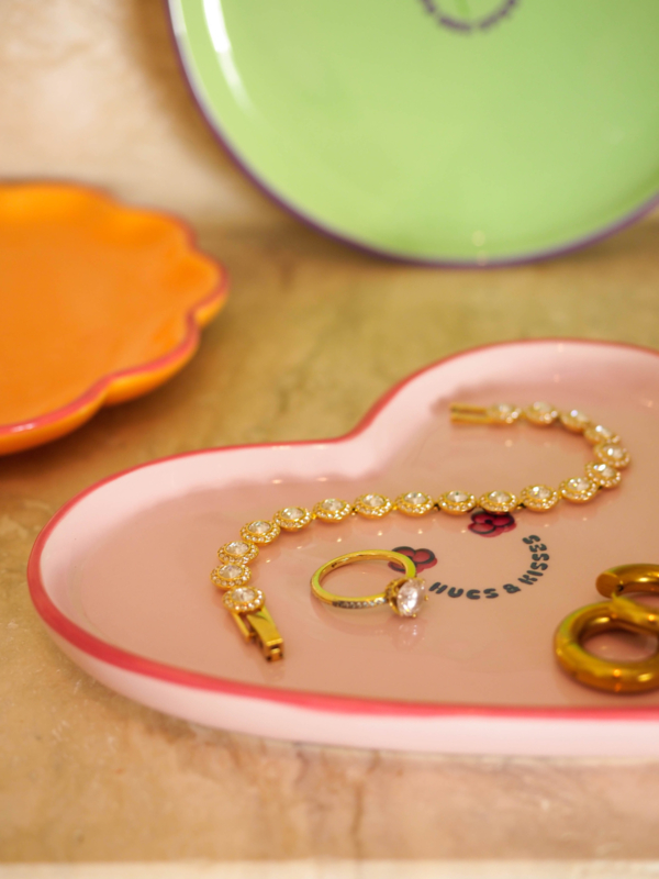 Bordje in de vorm van een hart in het roze en de tekst Hugs & kisses. Leuk om lekkers op te serveren of om aan de muur te hangen.