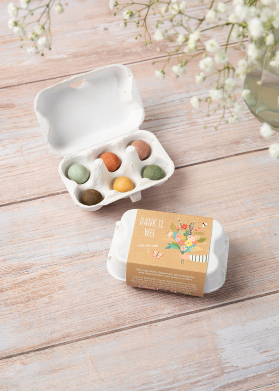 Artikelnummer: 101830Een grappig cadeau eierdoosje met 6 kleurrijke Blossombs.