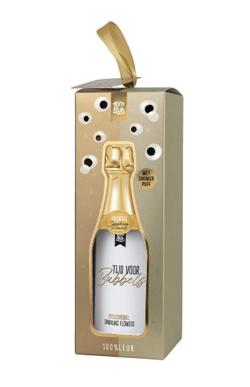 100% Leuk Douchegel "Tijd voor bubbels"DOUCHEGEL MET PUFF – TIJD VOOR BUBBELS∙ De douchegel is feestelijk verpakt en is gemaakt van FSC gecertificeerd karton
