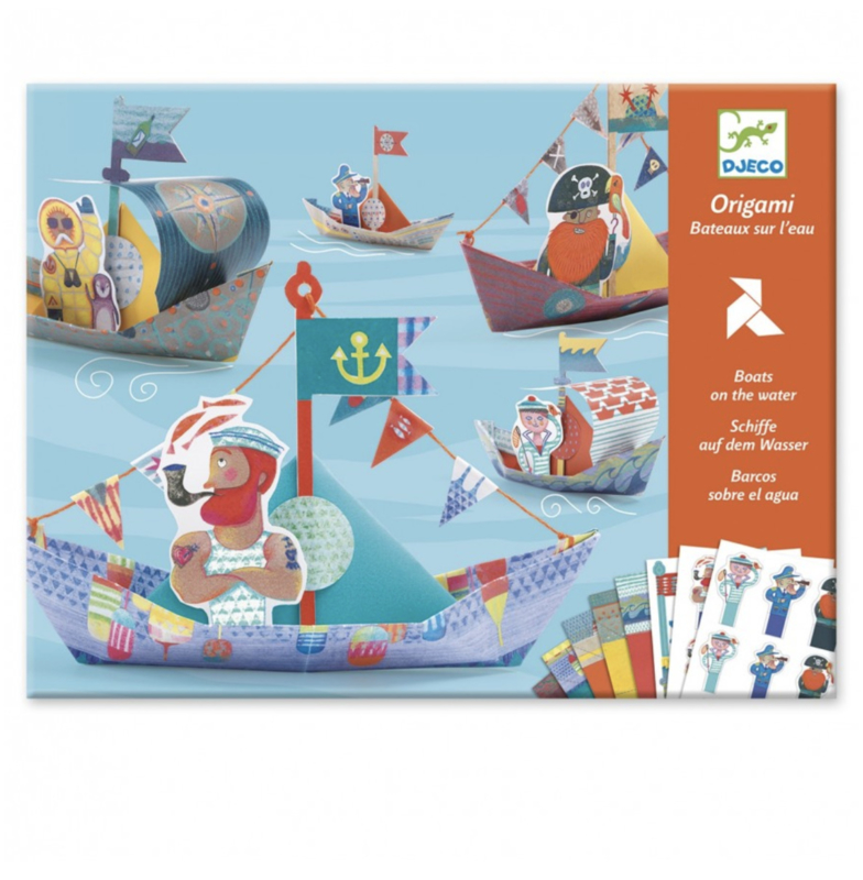 Djeco Origami "Boten op het water" | 6+Dit origami Boten op het water pakket bevat 15 (3x5) waterbestendige geïllustreerde vellen, 4 vellen met pre cut vormen (matrozen), 3 stickerbladen, draad en een instructieboekje.