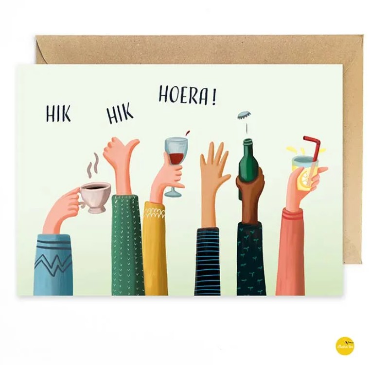 Super grappige wenskaart Hik hik Hoera! Voor elke gelegenheid waar iets gedronken wordt. Zelfs een koffietje.