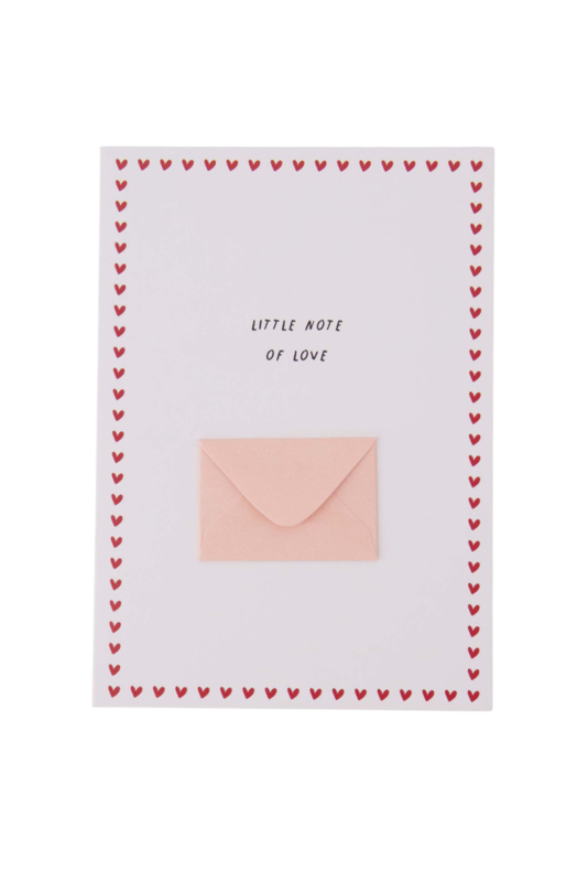 Zusss Wenskaart "Little note of love"WENSKAART LTTLE NOTE OF LOVEDeze ansichtkaart is omringt met hartjes. In het midden is een klein envelopje waarin je wat briefgeld of een klein briefje kan stoppen.