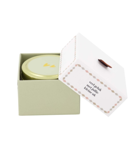 Zusss Geurkaars "Veel geluk met jullie kleine uk"Een geurkaarsje tinnen in doosje van Zusss brengt warmte en sfeer in huis.