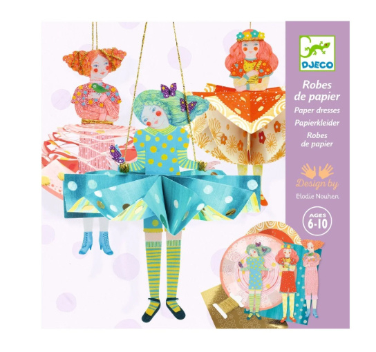 Djeco Lovely Paper "Jurken van papier" | 6 - 10 jaarEen eenvoudige en slimme vouwactiviteit om 3 papieren jurken te maken en de 3 meisjes te hullen in een prachtige en schitterende outfit. 3 mooie mobielen om te versieren met stickers en in je slaapkamer op te hangen.