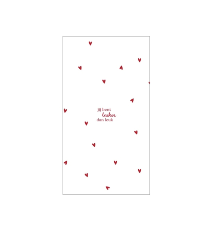 Zusss | Servetten "leuker dan leuk" 11x20cm wit/roodLangwerpige servetten met de leuke tekst "Leuker dan Leuk"afmetingen: 11x20 cm