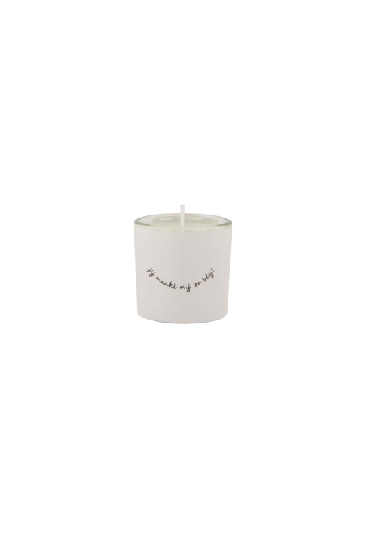 Zusss - geurkaarsje in wikkel - Jij maakt mij zo blij!Hoe leuk is dit geurkaarsje van Zusss! Op dit witte kaarsje staat in gouden letters 'jij maakt mij zo blij!'. De kaars ruikt heerlijk naar schone was! Deze geurkaars heeft een formaat van 4,7x4,4cm.