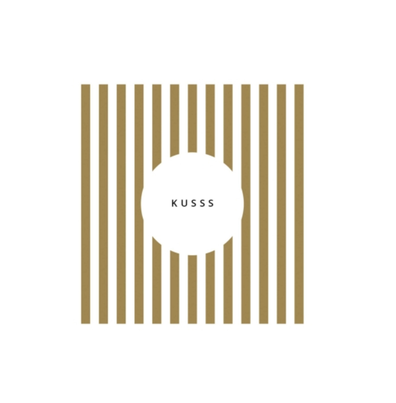 Zusss | Servetten "kusss" streep 12,5x12,5cm wit/okervierkante servetten met de tekst "Kusss" in de kleur oker/witafmetingen: 12,5x12,5 cm