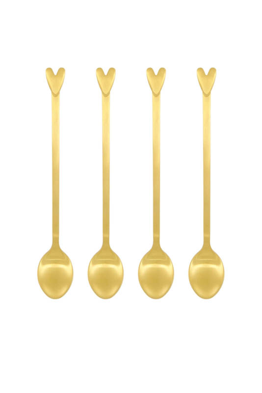 Zusss Set van 4 lange gouden lepeltjes "hartje"SET 4 LEPELS HARTJEWat die toffe hoge koffiemokken helemaal zou afmaken? Een gezellig lepeltje met een hartje. Leuk voor in je ijskoffie of latte macchiato.